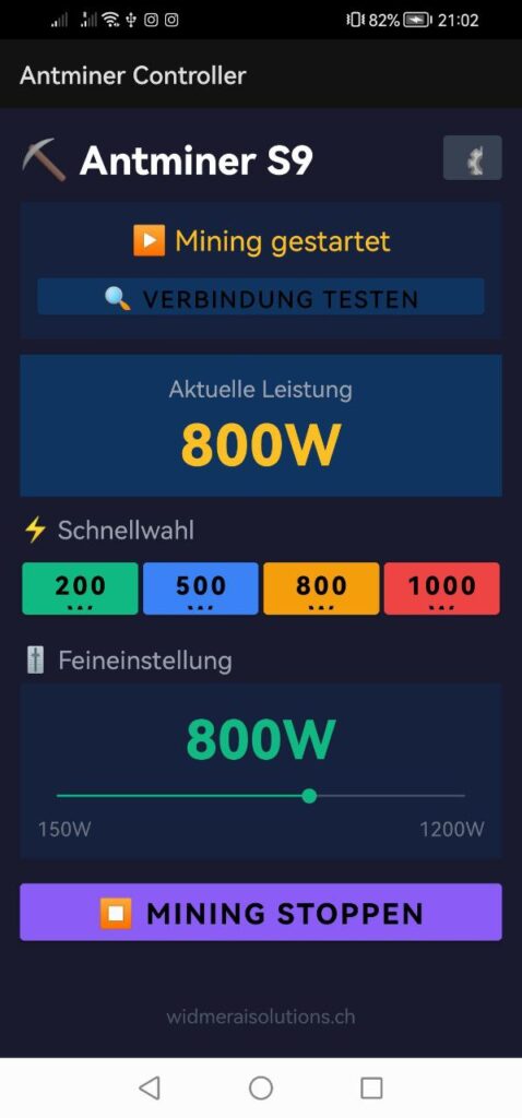 - **Schnellzugriff** auf die wichtigsten Leistungsstufen (200W, 500W, 800W, 1000W) - **Feineinstellung** per Slider für präzise Anpassungen - **Live-Monitoring** von Hashrate, Temperatur und Stromverbrauch - **Start/Stop** des Mining-Prozesses - **Automatische Aktualisierung** der Anzeige
